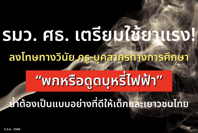 | • รมว. ศธ. เตรียมใช้ยาแรง! ลงโทษทางวินัย ครู-บุคลากรทางการศึกษา พกหรือดูดบุหรี่ไฟฟ้า ย้ำต้องเป็นแบบอย่างที่ดีให้เด็กและเยาวชนไทย |