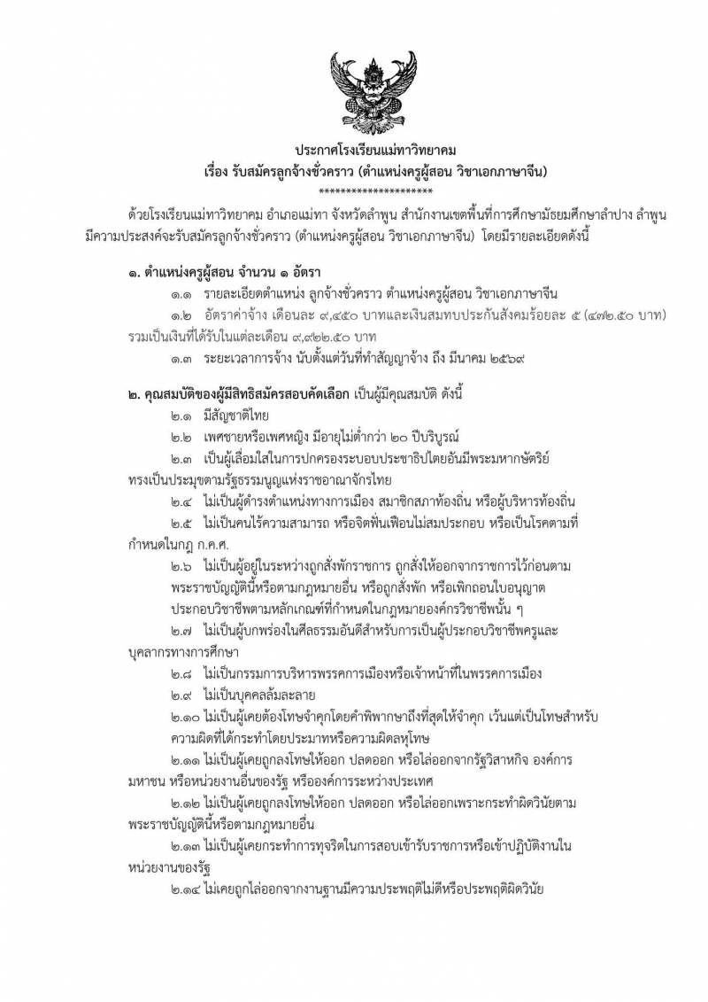 รร.แม่ทาวิทยาคม รับสมัครครูภาษาจีนและนักการภารโรง