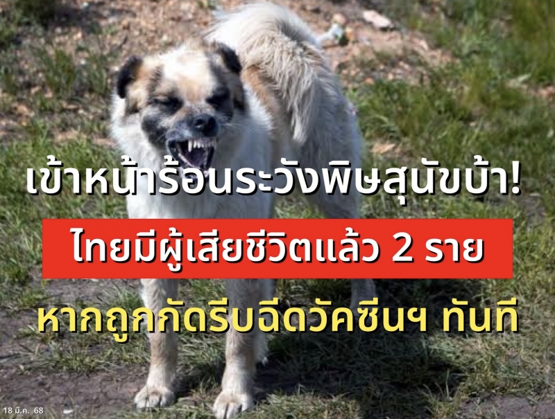 (17 มีนาคม 2568) นายอนุกูล พฤกษานุศักดิ์ รองโฆษกประจำสำนักนายกรัฐมนตรี เปิดเผยว่า กรมควบคุมโรค โดยกระทรวงสาธารณสุข เผยข้อมูลระหว่างวันที่ 1 มกราคม ถึง 9 มีนาคม 2568 พบว่าประเทศไทยมีผู้เสียชีวิตด้วยโรคพิษสุนัขบ้าแล้วจำนวน 2 ราย ที่จังหวัดชลบุรีและศรีสะเกษ โดยทั้ง 2 รายถูกสุนัขกัดและไม่ไปพบแพทย์เพื่อรับการฉีดวัคซีนป้องกันโรคพิษสุนัขบ้า หลังสัมผัสกับสัตว์ที่เป็นโรค