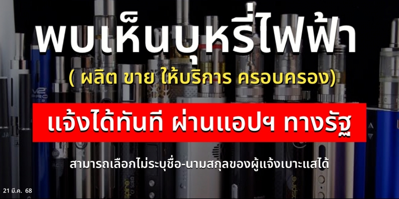 พบเห็นบุหรี่ไฟฟ้า( ผลิต ขาย ให้บริการ ครอบครอง) แจ้งได้ทันที ผ่านแอปฯ ทางรัฐ