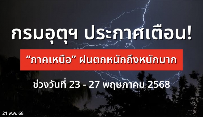 | • กรมอุตุฯ ประกาศเตือน! ฝนตกหนักถึงหนักมากบริเวณภาคเหนือในช่วงวันที่ 23 - 27 พฤษภาคม 2568 |