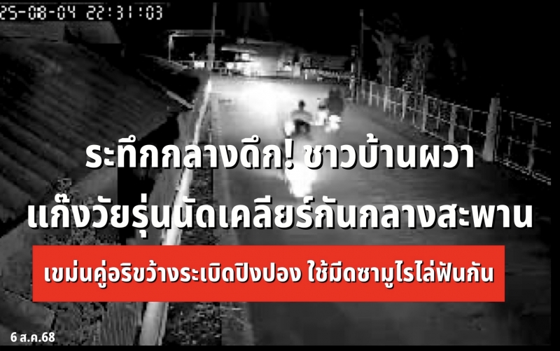 | • ระทึกกลางดึก! ชาวบ้านผวา แก๊งวัยรุ่นนัดเคลียร์กันกลางสะพานบ้านดง เขม่นคู่อริขว้างระเบิดปิงปอง และใช้มีดซามูไรไล่ฟันกัน แล้วหลบหนีไป |