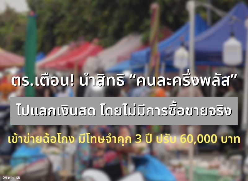 | • สำนักงานตำรวจแห่งชาติเตือน นำสิทธิ คนละครึ่งพลัส ไปแลกเงินสด โดยไม่มีการซื้อขายจริง เข้าข่ายฉ้อโกง มีโทษจำคุก 3 ปี ปรับ 60,000 บาท |