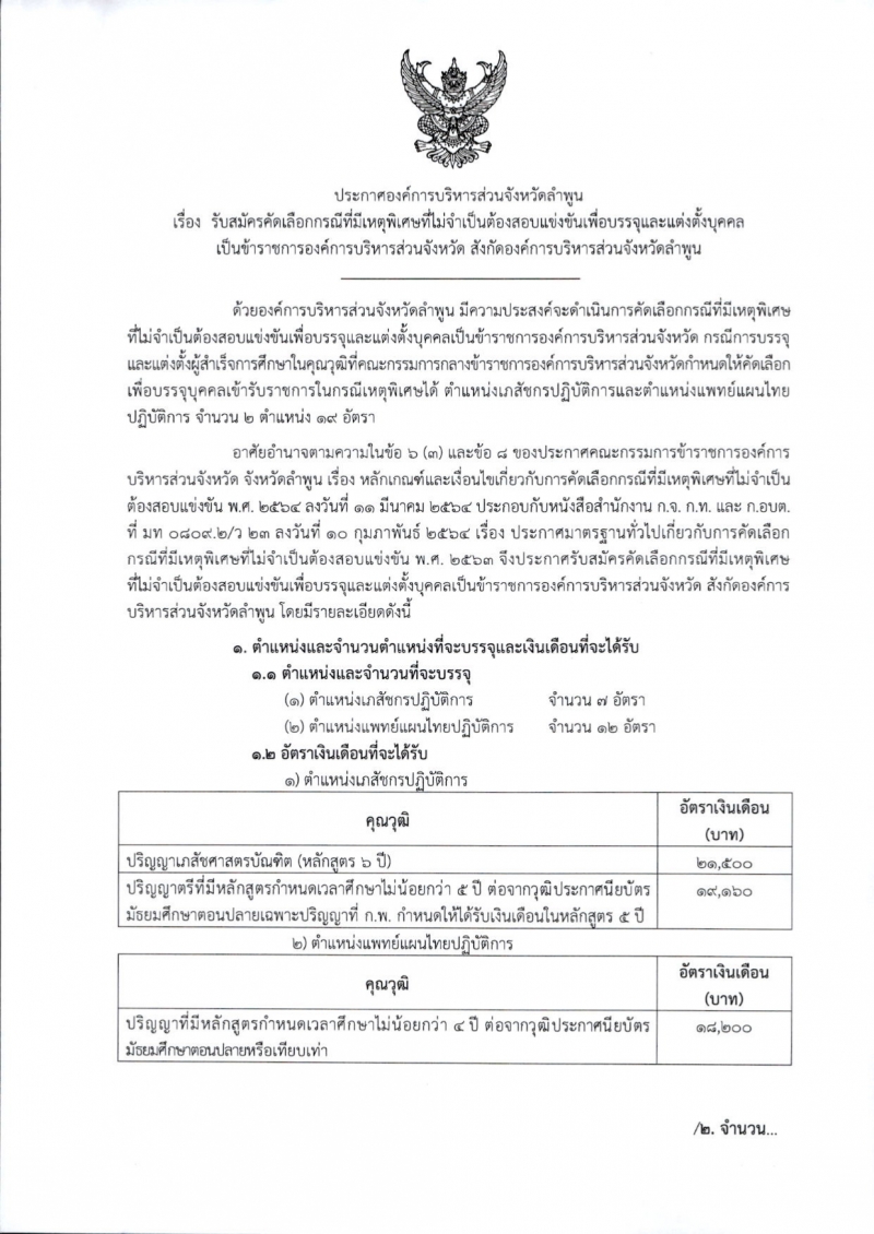 อบจ.ลำพูน รับสมัครเภสัชกร แพทย์แผนไทย รวม 19อัตรา เงินเดือน 18,200-21,500 สมัครถึง 28พ.ย.68