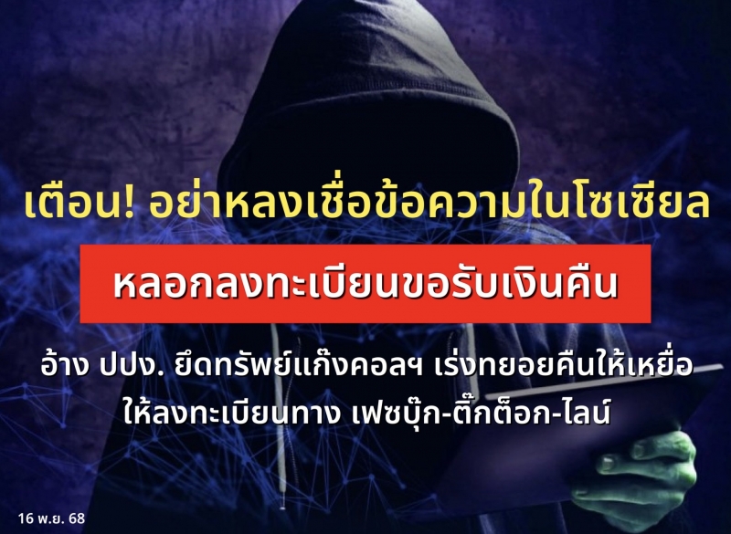 | • เตือน! อย่าหลงเชื่อข้อความในโซเซียล หลอกลงทะเบียนขอรับเงินคืน อ้าง ปปง. ยึดทรัพย์แก๊งคอลฯ เร่งทยอยคืนให้เหยื่อ ย้ำ! ปปง. ไม่มีระบบคุ้มครองสิทธิฯ ทางเฟซบุ๊ก ติ๊กต็อก และไลน์ |