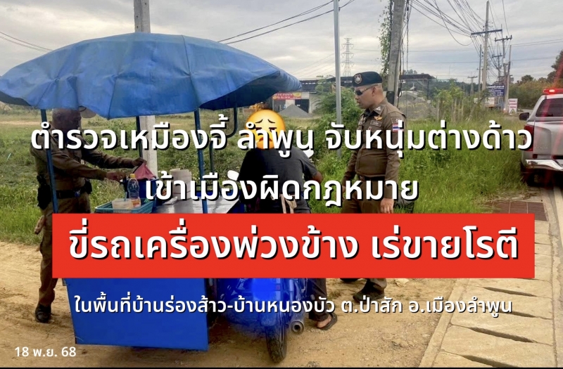 พบชายหนึ่งคน ขับรถ จยย.พ่วงข้างเร่ขายอาหาร(โรตี) ถนนสายบ้านร่องส้าว-บ้านหนองบัว ม.2  ต.ป่าสัก อ.เมืองลำพูน จว.ลำพูน  มีอาการพิรุธ จึงได้จอดรถแสดงตนเป็นเจ้าหน้าที่ตำรวจ ขอตรวจสอบ บัตรประจำตัว พบไม่มีแสดง สอบถามรับว่าเป็นคนต่างด้าวเข้าเมืองผิดกฎหมาย มาประกอบอาชีพเร่ขายโรตี   จึงได้จับกุมฐานความผิด เป็นคนต่างด้าวเข้ามาและอยู่ในราชอาณาจักรโดยไม่ได้รับอนุญาต และเป็นคนต่างด้าวประกอบอาชีพ ต้องห้าม เร่ขายสินค้า อาหาร(โรตี) โดยไม่ได้รับอนุญาต  นำตัวพร้อมของกลางส่งพนักงานสอบสวนสถานีตำรวจภูธรเหมืองจี้ ต่อไป