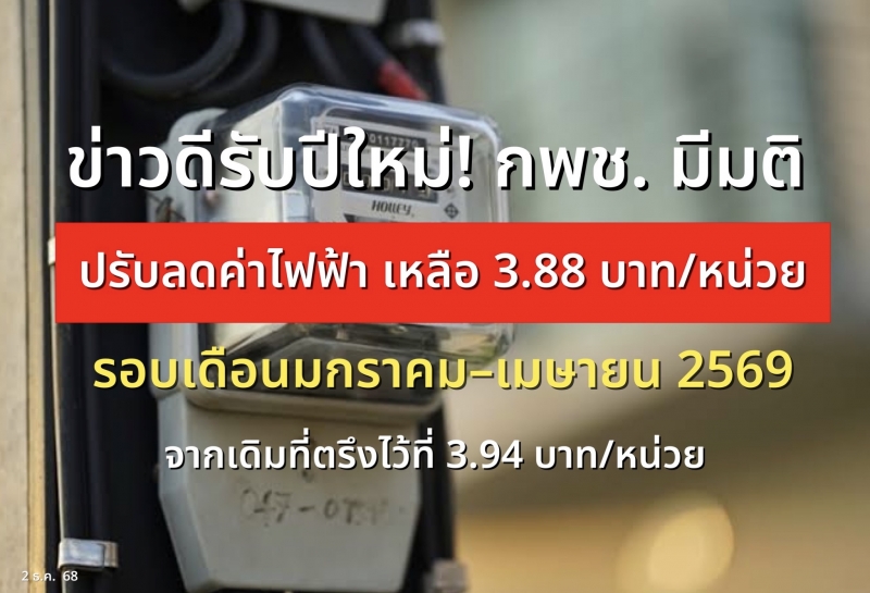 | • ข่าวดีรับปีใหม่! กพช. มีมติปรับลดค่าไฟฟ้า รอบเดือนมกราคมเมษายน 2569 เหลือ 3.88 บาท/หน่วย |