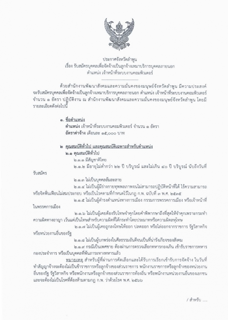 รับสมัคร เจ้าหน้าที่ระบบงานคอมพิวเตอร์ จำนวน 1 ตำแหน่ง และ เจ้าหน้าที่ช่วยปฏิบัติงานนักพัฒนาสังคม 1 ตำแหน่ง