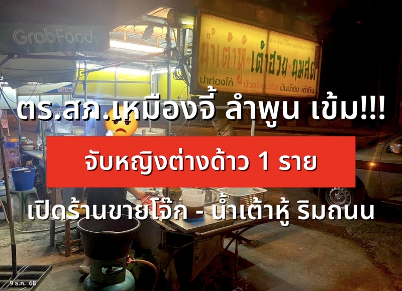 ( เวลา 18.30 น. ) โดยการอำนวยการและสั่งการของพ.ต.อ.ธนากร คำวะรัตน์ผกก(สอบสวน)กลุ่มงานสอบสวน บก.สส.ภ.5 รรท.ผกก.สภ.เหมืองจี้,พ.ต.ท.ศักดิ์ชาย สิทธิชมภู รอง ผกก.ป.สภ.เหมืองจี้, พ.ต.ต.ศาสตร์วิชัย พรหมจ้อย สวป.สภ.เหมืองจี้ สั่งการให้ ร.ต.ท.อุดมศักดิ์ โกมลธง รอง สว.(สส.) สภ.เหมืองจี้ ปฏิบัติหน้าที่ ร้อยเวร 20 พร้อม ส.ต.ท.วรพล จิกยอง สายตรวจ 201 ออกตรวจพื้นที่ รับผิดชอบ ขณะออกตรวจ พบมีหญิงสาวจำนวน 1 คนยืนขายโจ๊ก ,น้ำเต้าหู้ ริมถนนสาย 116 ม.15 บ้านน้ำบ่อเหลือง ต.ป่าสัก อ.เมืองลำพูน จว.ลำพูน มีลักษณะคล้ายเป็นบุคคลต่างด้าว จึงได้ทำการตรวจสอบ พบว่าเป็นบุคคลต่างด้าวสัญชาติเมียนมาได้รับอนุญาต ให้ทำงานเป็นกรรมกร แต่มาประกอบอาชีพขายน้ำเต้าหู้ จึงได้ทำการจับกุม นำส่งพนักงานสอบสวนสถานีตำรวจภูธรเหมืองจี้ ดำเนินการตามกฎหมายต่อไป