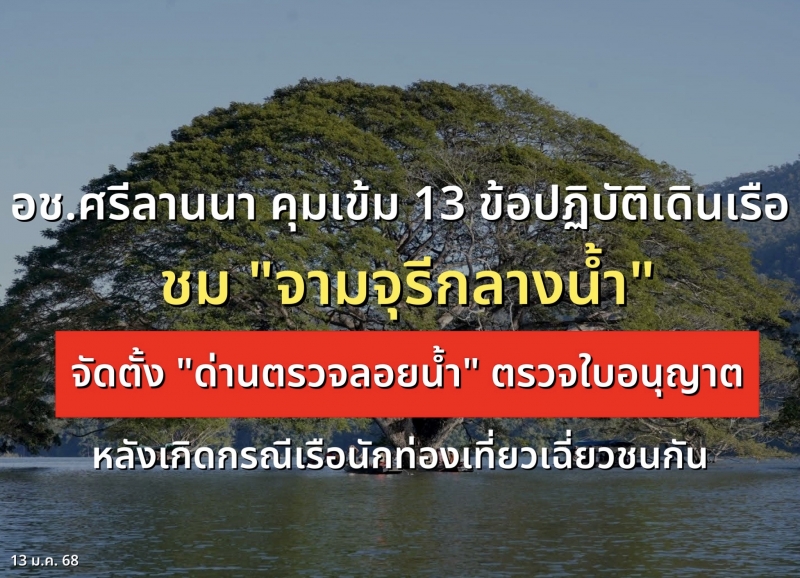 | • อช.ศรีลานนา คุมเข้ม 13 ข้อปฏิบัติเดินเรือ ชม "จามจุรีกลางน้ำ" หลังเกิดกรณีเรือนักท่องเที่ยวเฉี่ยวชนกัน |