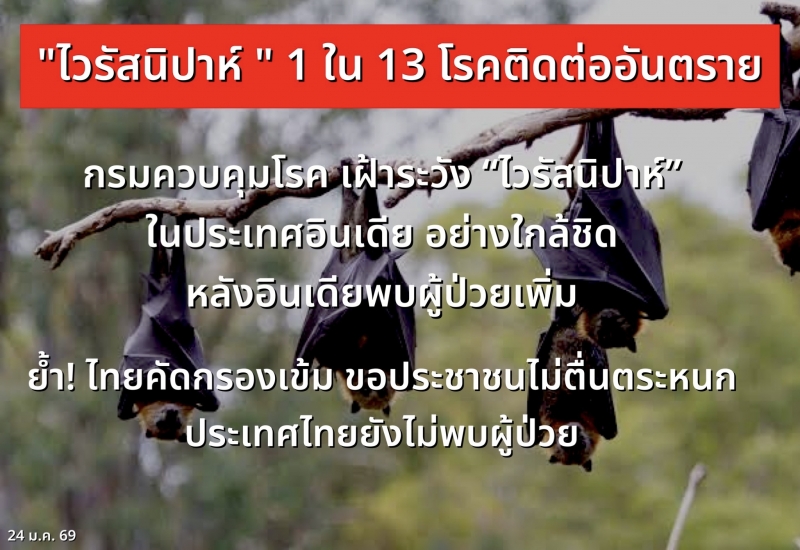 | • กรมควบคุมโรคเฝ้าระวัง ไวรัสนิปาห์ ใกล้ชิด หลังอินเดียพบผู้ป่วยเพิ่ม ย้ำไทยคัดกรองเข้ม ขอประชาชนไม่ตื่นตระหนก |
