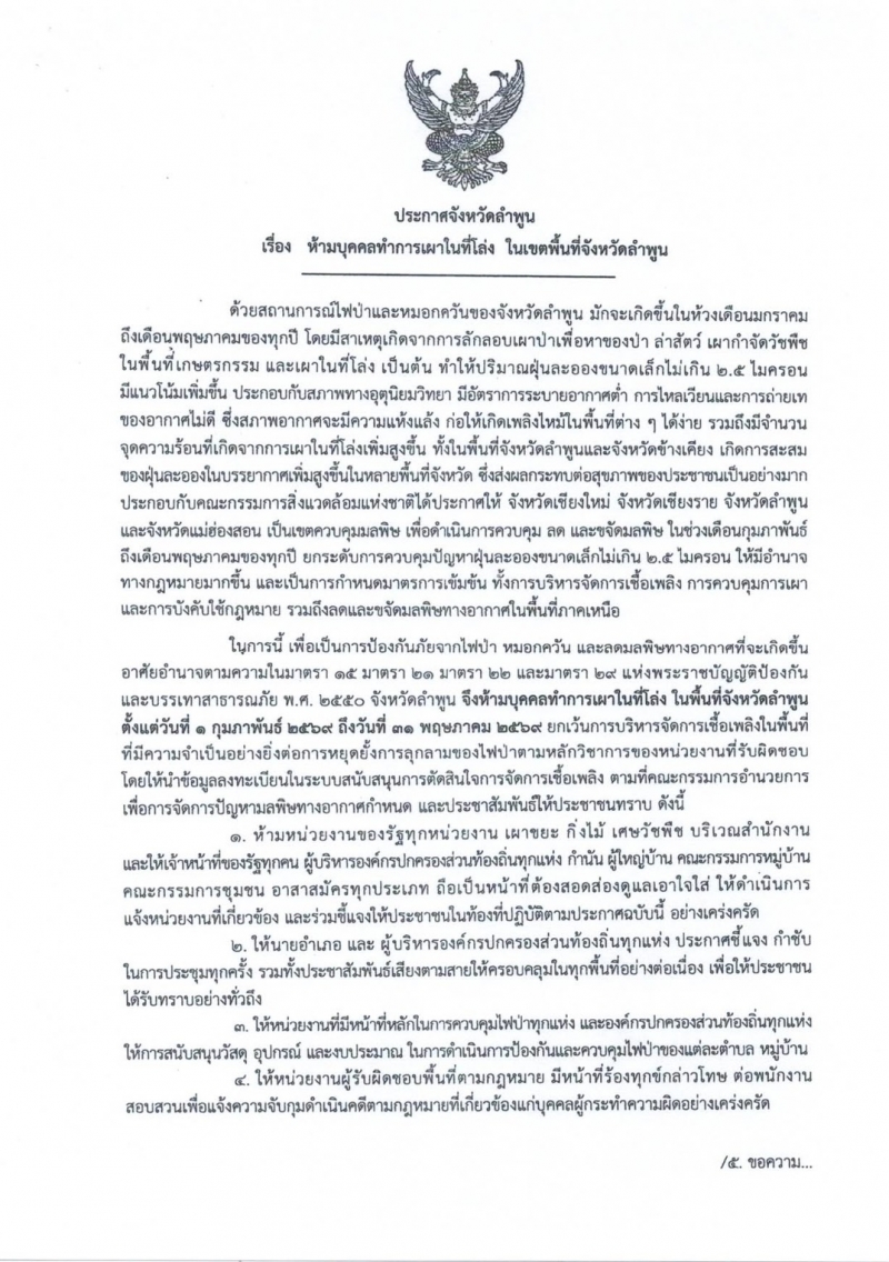 ประกาศจังหวัดลำพูน เรื่อง ห้ามบุคคลทำการเผาในที่โล่ง ในเขตพื้นที่จังหวัดลำพูน “ตั้งแต่วันที่ 1 กุมภาพันธ์ ถึง 31 พฤษภาคม 2569”