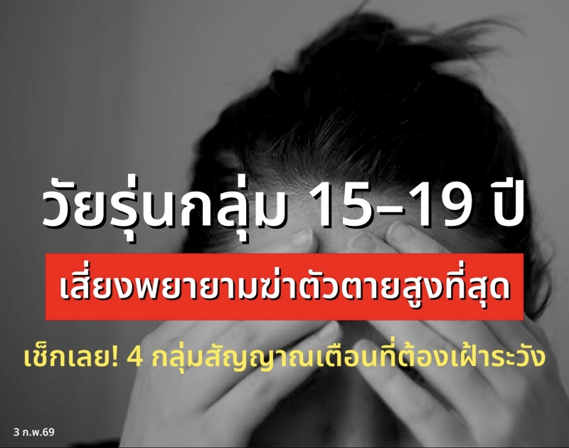 | • กรมสุขภาพจิต ย้ำ! วัยรุ่นกลุ่ม 1519 ปี เสี่ยงพยายามฆ่าตัวตายสูงที่สุด เช็กเลย! 4 กลุ่มสัญญาณเตือนที่ต้องเฝ้าระวัง |