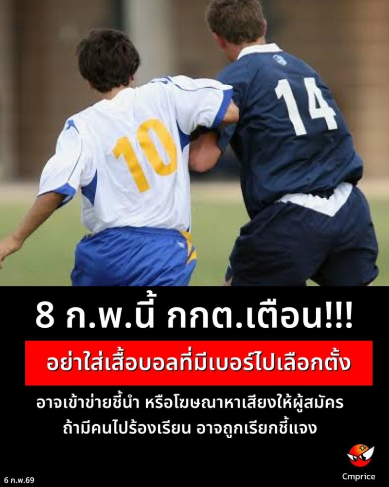 8 ก.พ.นี้ "กกต." เตือนประชาชน อย่าใส่เสื้อบอลที่มีเบอร์ไปเลือกตั้ง อาจเข้าข่ายชี้นำ หรือโฆษณาหาเสียงให้ผู้สมัคร ถ้ามีคนไปร้องเรียน อาจถูกเรียกชี้แจง