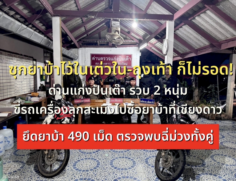 พฤติการณ์ : เจ้าหน้าที่ชุดจับกุมปฏิบัติหน้าที่ ด่านตรวจแก่งปันเต๊า ได้เรียกตรวจรถจักรยานยนต์ ยี่ห้อฮอนด้า สีดำแดง หมายเลขทะเบียน 3กขxxxx เชียงใหม่ โดยมีนายกิจจา หรือเอ็ม (ทราบชื่อภายหลัง) ขับขี่มาจาก อ.เชียงดาว มุ่งหน้า อ.แม่แตง มีอาการพิรุธ เจ้าหน้าที่จึงเรียกเพื่อขอตรวจค้น โดยก่อนการตรวจค้นเจ้าหน้าที่ชุดจับกุมได้แสดงความบริสุทธิ์ใจให้นายกิจจาฯ (ผู้ต้องหาที่ 2) ผลการตรวจค้นไม่พบสิ่งของผิดกฎหมาย ต่อมาได้มี รถจักรยานยนต์ ยี่ห้อฮอนด้า สีดำแดง หมายเลขทะเบียน3กญxxxx เชียงใหม่ โดยมีนายมิ้น หรือไม้(ทราบชื่อภายหลัง) เป็นผู้ขับขี่ มาจาก อ.เชียงดาว มุ่งหน้า อ.แม่แตง จึงได้เรียกตรวจค้น ผลการตรวจค้นพบของกลางยาบ้า 490 เม็ด