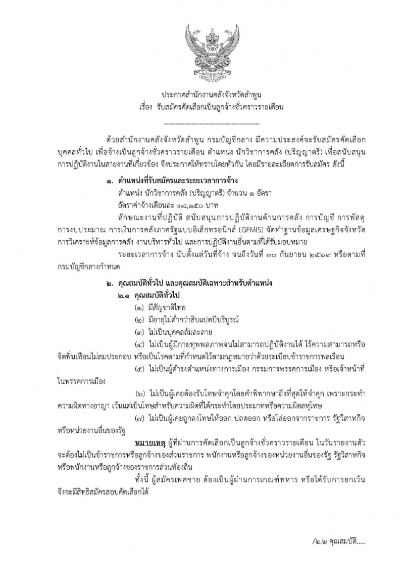 สำนักงานคลังจังหวัดลำพูน ประกาศรับสมัครคัดเลือกบุคคลทั่วไปเพื่อจ้างเป็นลูกจ้างชั่วคราวรายเดือน ตำแหน่งนักวิชาการคลัง (ปริญญาตรี) จำนวน 1 อัตรา โดยสามารถส่งใบสมัครได้ที่สำนักงานคลังจังหวัดลำพูน ชั้น 1 ศาลากลางจังหวัดลำพูน ตั้งแต่วันที่ 2 - 9 มีนาคม พ.ศ. 2569 (ในวันและเวลาราชการ)