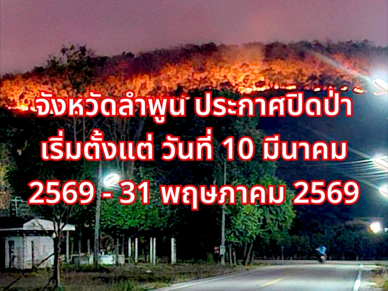 จังหวัดลำพูน ประกาศปิดป่าเริ่มตั้งแต่ วันที่ 10 มีนาคม 2569 - 31 พฤษภาคม 2569 โดยมีรายละเอียดความสำคัญของประกาศดังนี้