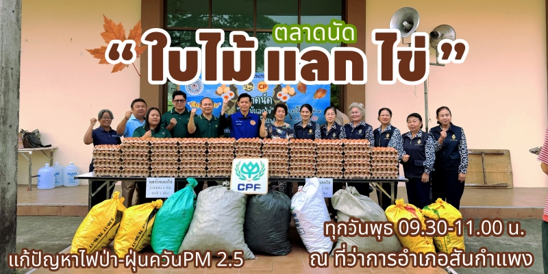 กิจกรรม “ตลาดนัดใบไม้แลกไข่” เกิดจากความร่วมมือระหว่าง อ.สันกำแพง จ.เชียงใหม่ และ บริษัท เจริญโภคภัณฑ์อาหาร จำกัด (มหาชน) หรือซีพีเอฟ ที่มีฟาร์มไก่ไข่อยู่ในพื้นที่ โดยปีนี้จัดต่อเนื่องเป็นปีที่ 2 ให้ประชาชนนำใบไม้แห้ง 2 กิโลกรัม มาแลกไข่ไก่ CP ได้ 1 ฟอง สูงสุด 20 กิโลกรัมต่อครั้งต่อวัน หรือวันละ 10 ฟอง