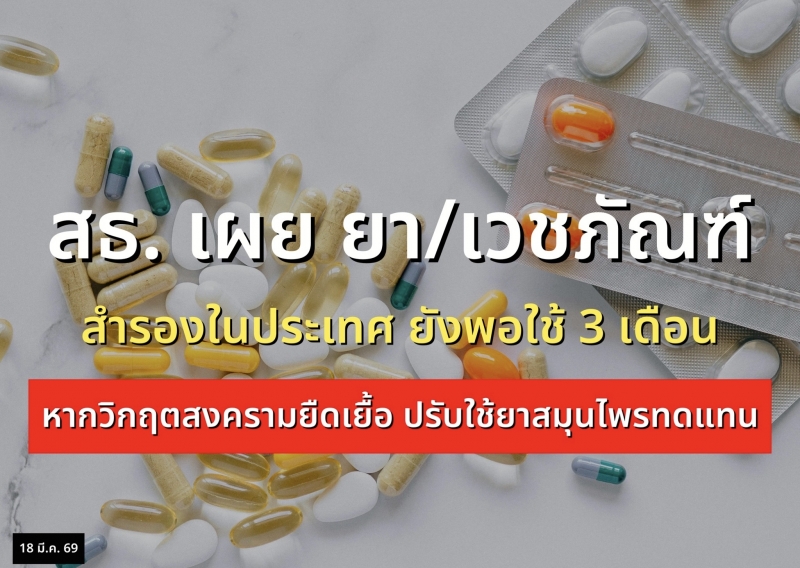| • สธ. เผย ยา/เวชภัณฑ์สำรองในประเทศยังพอใช้ 3 เดือน หากวิกฤตสงครามตะวันออกกลางยืดเยื้อ ปรับใช้ยาสมุนไพรทดแทน |