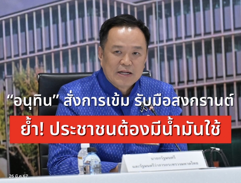 เมื่อวันที่ 25 มีนาคม 2569 นายอนุทิน ชาญวีรกูล นายกรัฐมนตรี เปิดเผยภายหลังติดตามสถานการณ์พลังงานว่า ได้สั่งการทุกหน่วยงานที่เกี่ยวข้อง เตรียมความพร้อมรองรับการเดินทางของประชาชนในช่วงเทศกาลสงกรานต์ โดยย้ำชัดว่า ประชาชนต้องไม่มีปัญหาเรื่องน้ำมัน ทั้งการเดินทางไปและกลับภูมิลำเนา นายกรัฐมนตรีระบุว่า แม้สถานการณ์พลังงานโลกยังผันผวน แต่ข้อเท็จจริงในประเทศไทยน้ำมันไม่ได้ขาด โดยกำลังการผลิตยังอยู่ในระดับปกติ และมีการจัดหาน้ำมันล่วงหน้าอย่างต่อเนื่องไปจนถึงปลายเดือนพฤษภาคม อย่างไรก็ตาม รัฐบาลกังวลปัญหาการกักตุนและเก็งกำไร จึงได้สั่งการให้กระทรวงยุติธรรม กรมสอบสวนคดีพิเศษ (DSI) และตำรวจ เร่งตรวจสอบและดำเนินคดีกับผู้กระทำผิดอย่างจริงจัง โดยชี้ว่าการกักตุนในระดับคลัง ไม่ใช่เพียงการสำรองเล็กน้อยของประชาชน และถือเป็นความผิดที่ต้องถูกดำเนินคดี พร้อมกันนี้ ได้กำชับให้ควบคุมราคาน้ำมันหน้าคลัง ห้ามสูงกว่าโรงกลั่น ตามกฎหมาย เพื่อป้องกันการบิดเบือนราคาและลดแรงจูงใจในการลักลอบกักตุน นายกรัฐมนตรีกล่าวอีกว่า เป้าหมายสำคัญของรัฐบาลคือการ ลดความตื่นตระหนก ของประชาชน ซึ่งเป็นปัจจัยหลักที่ทำให้ความต้องการใช้น้ำมันพุ่งสูง
