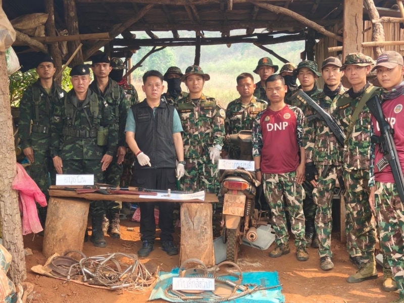 เจ้าหน้าที่ได้วางกำลังดักซุ่มและปิดล้อมพื้นที่อย่างต่อเนื่องจนถึงเช้าวันที่ 5 เมษายน 2569 เวลา 07.30 น. แต่ไม่พบผู้ใดปรากฏตัวย้อนกลับมา จึงเข้าตรวจค้นโดยละเอียดอีกครั้ง จนพบของกลางอันตรายซุกซ่อนอยู่ประกอบด้วย เครื่องกระสุน : กระสุนปืนขนาด .38 จำนวน 4 นัด และขนาด .22 จำนวน 2 นัด, อุปกรณ์ล่าสัตว์ : กับดักสลิงเหล็กสำหรับดักสัตว์ป่าขนาดใหญ่ จำนวน 7 อัน ซุกซ่อนในกระสอบปุ๋ย และยาเสพติด : ยาบ้า จำนวน 2 เม็ด ซุกซ่อนอยู่ในกระบอกไม้ไผ่
