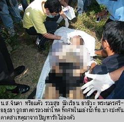 พบร่างเหยื่อฆาตกรรมนอนหงายในแอ่งน้ำ ชุดกระโปรงนักเรียนถูกถลกขึ้นมาเหนือขาและเสื้อถูกถลกขึ้นมาเหนือพุง ตรวจสภาพบาดแผลพบที่ศีรษะแตกคล้ายถูกตีด้วยของแข็ง ลำคอมีรอยช้ำ ในที่เกิดเหตุยังพบกระเป๋าสะพาย ภายในมีหนังสือและอุปกรณ์การเรียน รวมทั้งกระเป๋าสตางค์ รองเท้าของผู้ตาย และกองเลือดเป็นหย่อมๆ ทราบชื่อผู้ตายว่า น.ส.จินดา หรือแต้ว รวมสุข อายุ 16 ปี บ้านเดิมอยู่เลขที่ 155 หมู่ 4 ต.เวียง อ.เทิง จ.เชียงราย เรียนอยู่ชั้น ปวช.ปี 1 สาขาการโรงแรม โรงเรียนอาชีวะพระนครศรีอยุธยา