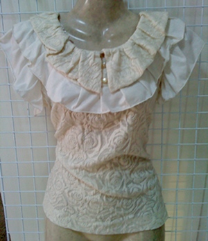 ขายเสื้อสีครีม เนื้อผ้าลายกุหลาบ แต่งระบายคอ และแขน