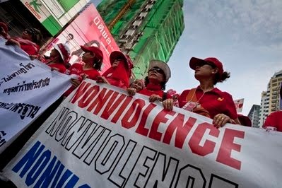 ผู้ ชุมนุมเสื้อแดงเดินขบวนพร้อมถือป้ายเรียกร้องปลดปล่อยนักโทษการเมือง ซึ่งต้องพลัดพรากจากครอบครัว และรายงานว่ามีผู้เข้าร่วมการเดินขบวนมากกว่า40,000คน ขณะที่ผู้จัดการชุมนุมอ้างว่ามีผู้เข้าร่วมการชุมนุมในช่วงค่ำเกิน กว่า100,000คน(ภาพข่าว:DAILYLIFE )เรียกร้องให้ใช้สันติวิธี โดยเรียกร้องกดดันให้จัดเลือกตั้งและตั้งรัฐบาลใหม่ (ภาพข่าว:AP)