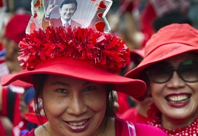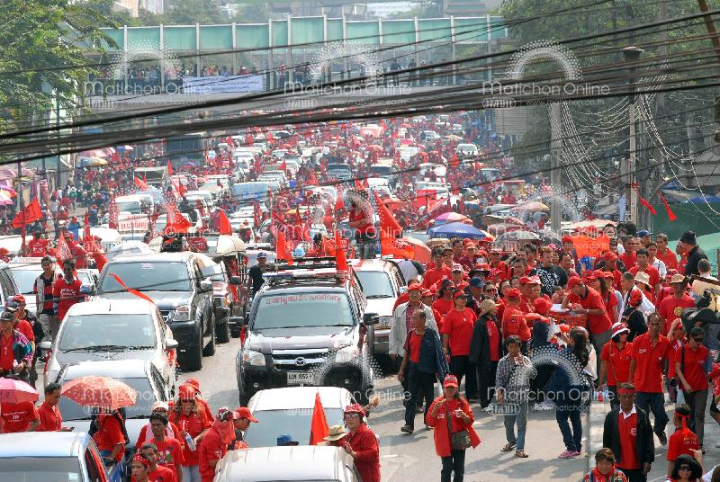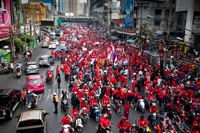 ขบวนผู้ชุมนุมเสื้อแดงบนท้องถนนเรียกร้องกดดันให้มีการจัดการเลือกตั้งใหม่ และจัดตั้งรัฐบาลใหม่(ภาพข่าว:AP) ซึ่งรอยเตอร์รายงาน ว่า มีผู้ร่วมเดินขบบวนกว่า 30,000 คน ขณะที่ผู้จัดการชุมนุมอ้างว่าช่วงค่ำที่อนุสาวรีย์ประชาธิปไตยมีผู้เข้าร่วม ชุมนุมเกิน100,000คน