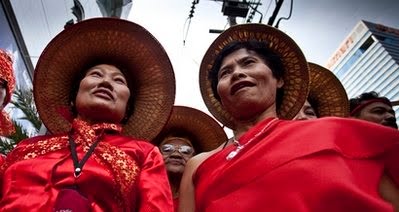 เด็ก หญิงในชุดแดงเต้นรำในการเข้าร่วมการชุมนุมประท้วงของเสื้อแดง และเรียกร้องให้ปลดปล่อยแกนนำและนักโทษการเมืองที่ถูกคุมขังไว้ตั้งแต่เดือน พฤษภาคมปีกลาย(ภาพข่าว:รอยเตอร์) ส่วนภาพล่างเป็นขบวนสตรีในชุดนักรบโบราณเสื้อแดงเข้าร่วมการเดินขบวน(ภาพข่าว:AP)