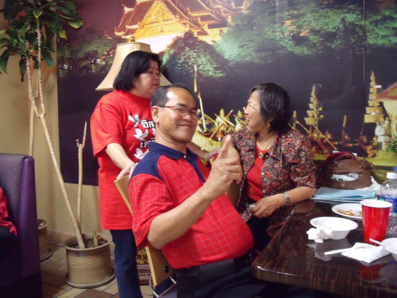 ภาพ ชาวไทยในชิคาโก้ มลรัฐอิลลินอยส์ได้ออกมมาร่วมกันเฉลิมฉลองชัยชนะครั้งยิ่งใหญ่อีกครั้งหนึ่ง โดยแจ้งว่า เราชาวเสื้อแดงและผู้ร้กประชาธิปไตยยังคิดถึงพี่น้องของเราอีกจำนวนมากที่ ยังรอความยุติธรรมอยู่ในเรือนจำ และอีกจำนวนมากที่ได้รับความบาดเจ็บล้มตาย
