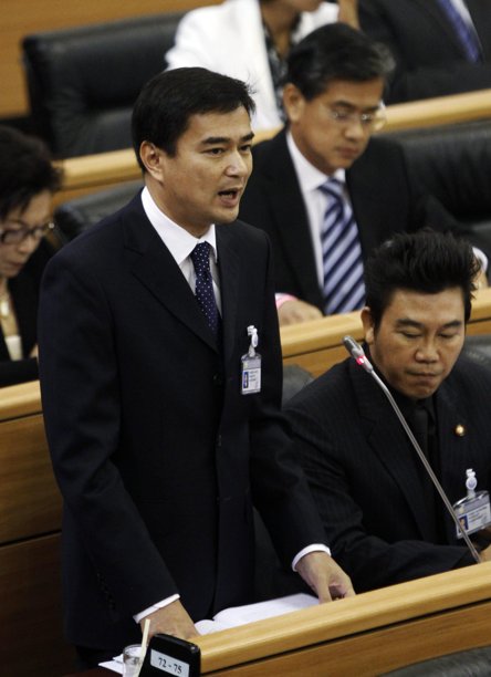 คนละอารมณ์-รอยเตอร์เสนอ ภาพข่าวนายอภิสิทธิ์ เวชชาชีวะ หัวหน้าพรรคฝ่ายค้านกล่าวอภิปรายนโยบายรัฐบาลว่า ทำอย่างไรนายกรัฐมนตรียิ่งลักษณ์จึงจะก้าวข้ามพ้นเงาของพ.ต.ท.ทักษิณ ชินวัตร ผู้พี่ชาย ขณะที่นายกรัฐมนตรีฟังด้วยท่าทีผ่อนคลายขำๆ