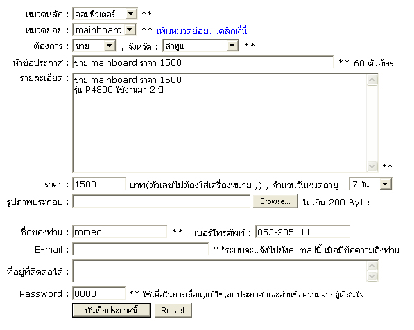 - การลงประกาศนั้นต้องเลือกและกรอกข้อมูลให้ครบตามที่มีเครื่องหมาย ** ให้ครบ
