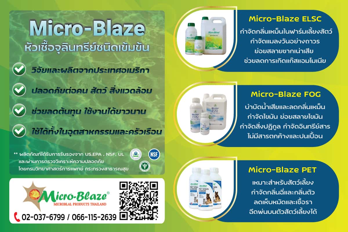 Micro-Blaze ช่วยในการย่อยสลายทางชีวเคมีของสารอินทรีย์และสามารถย่อยสลายสิ่งปฏิกูล ย่อยสลายไขมัน รวมทั้งกำจัดกลิ่นเหม็นและบำบัดน้ำเสียได้อย่างรวดเร็วโดยไม่ทิ้งคราบสกปรก มีความปลอดภัย ไม่เป็นอันตรายต่อคน สัตว์ และ สิ่งแวดล้อม เหมาะสำหรับโรงงานอุตสาหกรรม ฟาร์มปศุสัตว์ ที่พักอาศัย ร้านอาหาร บริษัทรับกำจัดสิ่งปฏิกูล ฯลฯ โดยมีให้เลือก 3 สูตร คือ