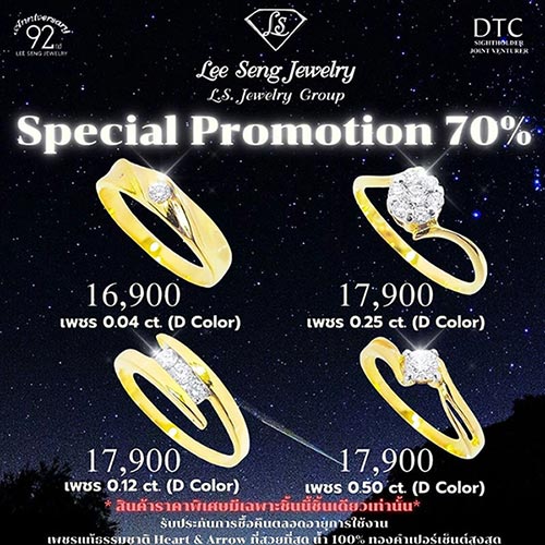 ห้างเพชรหลีเสง Special Promotion เพชร Cer เกรด Top 3Ex/H&A/None Flu ลดพิเศษสุดๆ สูงสุด 70%!! ด้วยเพชรแท้ธรรมชาติ (Natural Diamonds) ที่สวยที่สุด (Perfect Heart & Arrow Ideal Cut) พร้อมทองคำเปอร์เซ็นต์สูงสุด ในราคาสุดแสนพิเศษ อีกทั้งยังเป็นราคาต้นทุนเก่า ก่อนราคาทองคำและเพชรปรับขึ้นอย่างมาก (ตั้งแต่ทองบาทละ 20,000 กว่าบาท) นับเป็นโอกาสที่ดีที่สุดในการลงทุนจิวเวลรี่เพชร